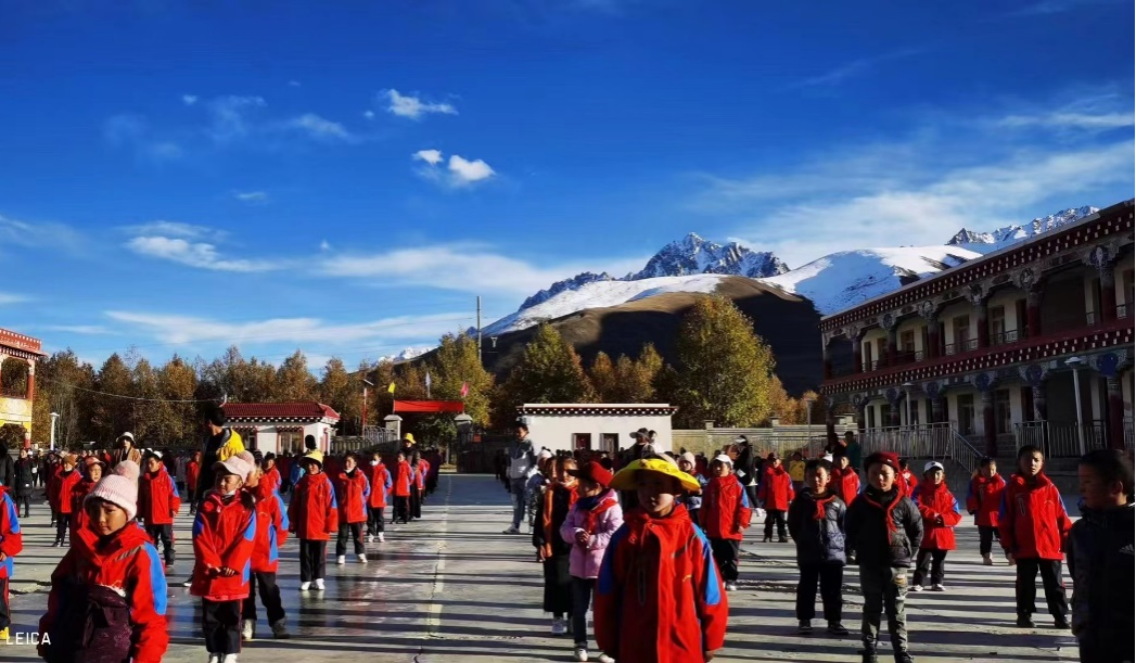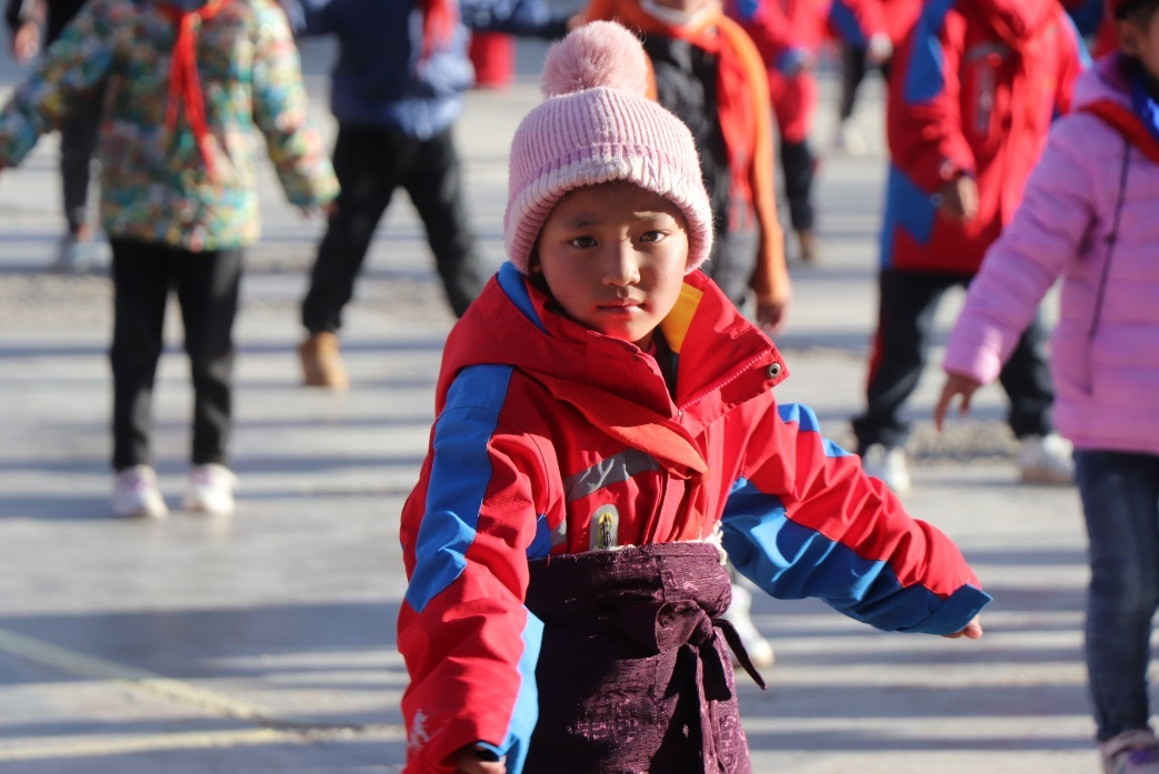 在雪山和陽光的沐浴下,孩子們跳著藏族鍋莊來歡迎遠來客人和對美好生活的歌頌。