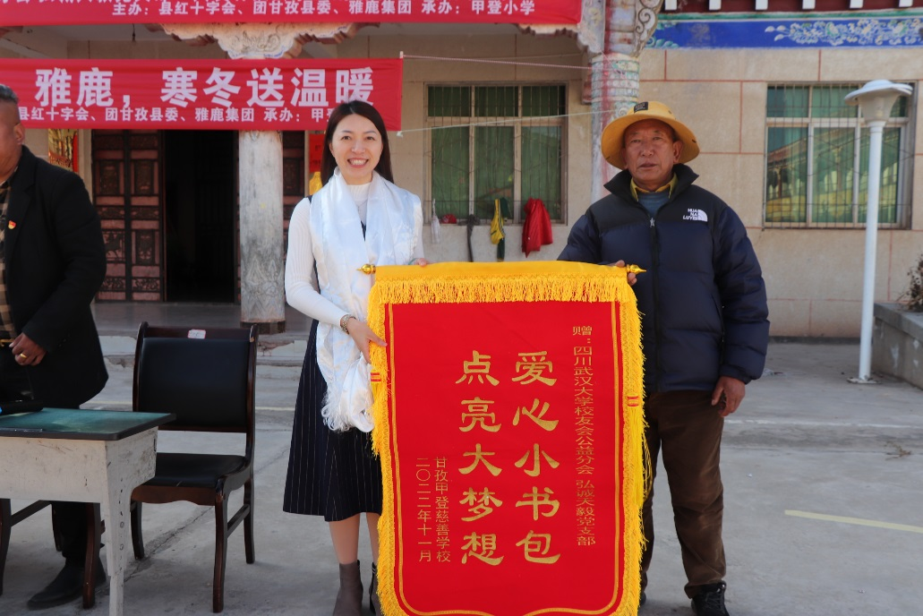 捐贈儀式上,四川武漢大學校友會公益分會、弘誠天毅公司總經理助理趙金香表示“這是一份禮物,也是一種鼓勵,希望你們好好學習,用知識改變命運,改善生活。”同時也用三個感動來表達自己的感情,第一個是被學校里在教育戰線上一路往前走的老師所感動,感謝他們的付出和堅守;第二個是一路走來感受了甘孜濃厚的文化和壯麗的美景,是對自己心靈上的洗禮,被當地人民的淳樸所感動,希望未來呼吁有更多的愛心人士走進甘孜;第三個是被孩子們樂觀積極的精神狀態、清澈的眼神所感動,從媽媽這個角色來祝福孩子,希望他們在陽光下健康成長,有一個快樂的童年。