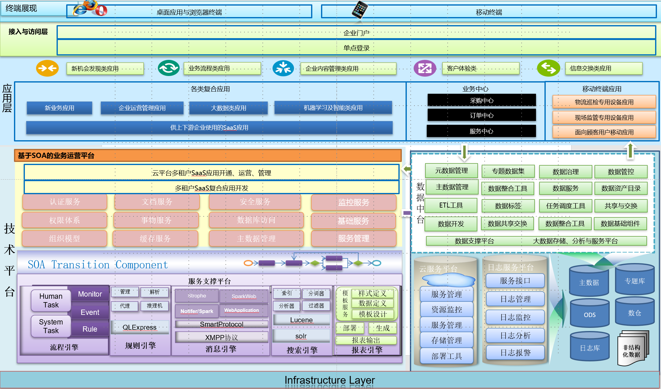 5)業務集成方面:基于企業服務總線(ESB)的體系架構,為企業的業務集成提供標準、開發的集成平臺。